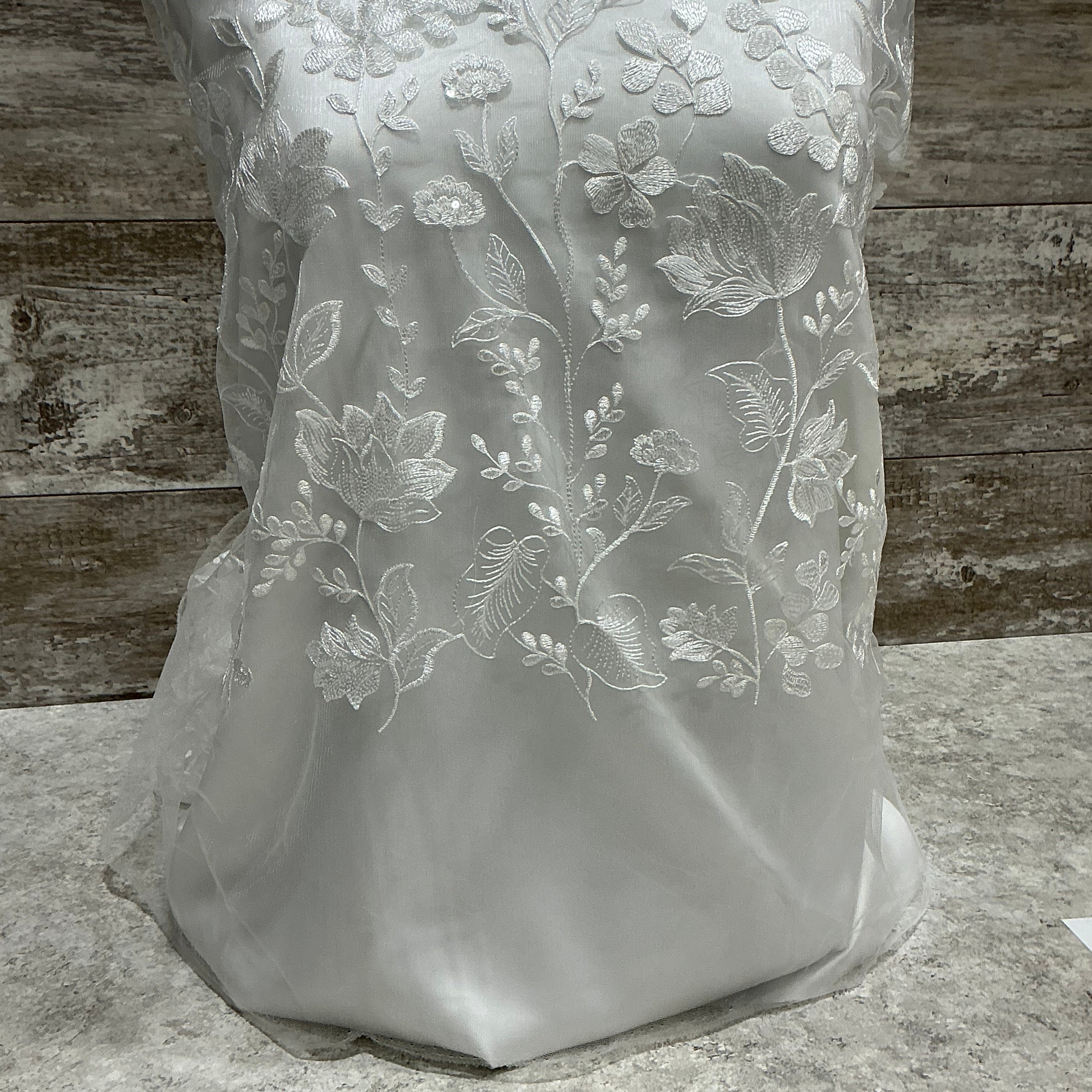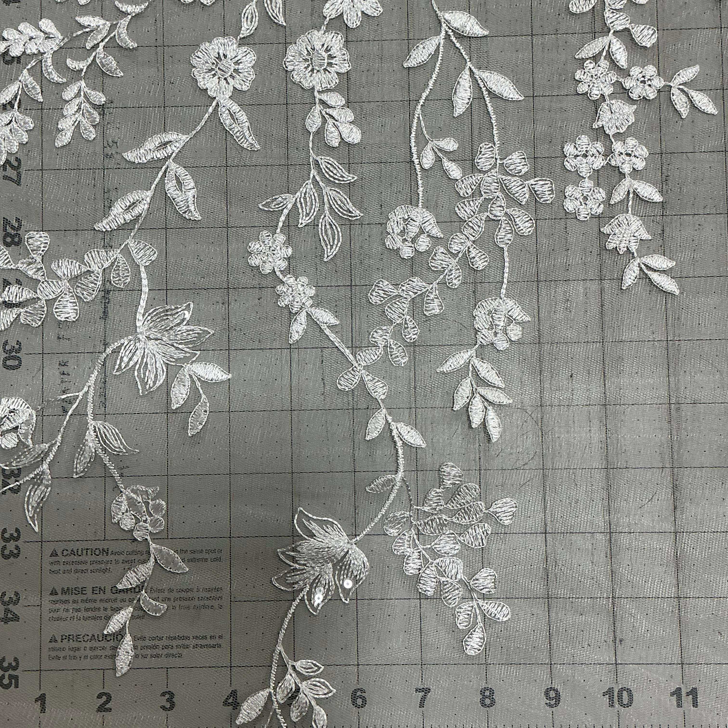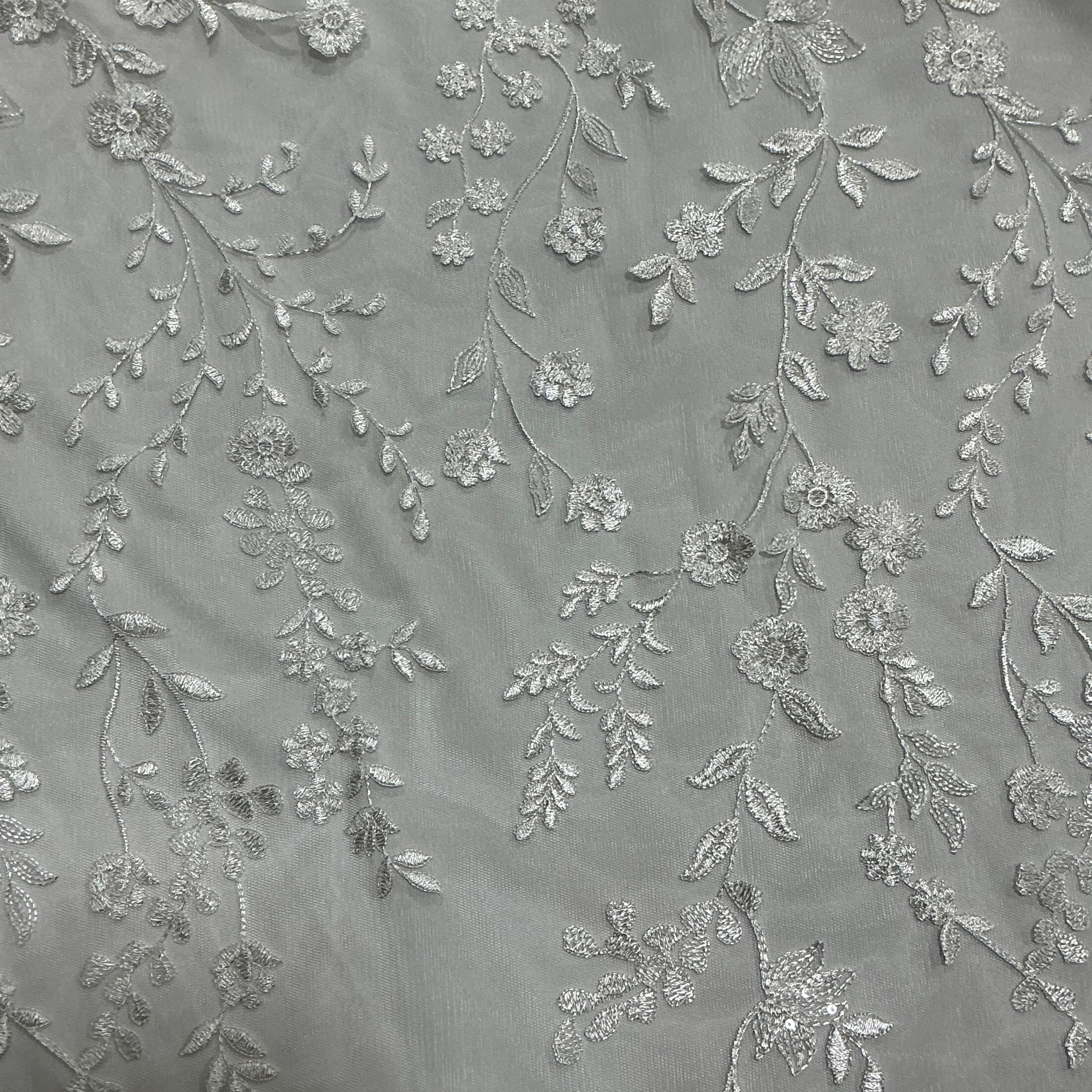 Description Details: This embroidered mesh is stunning! The ditsy floral trails upward with clear sequins shining with dewy sparkle.