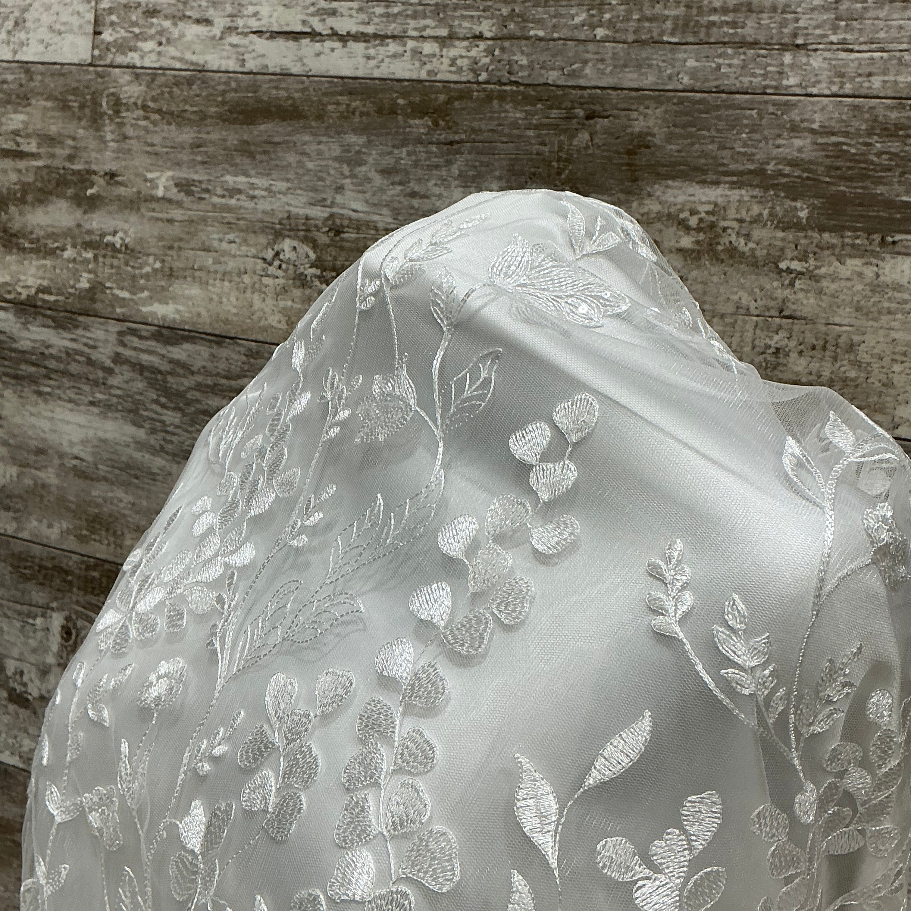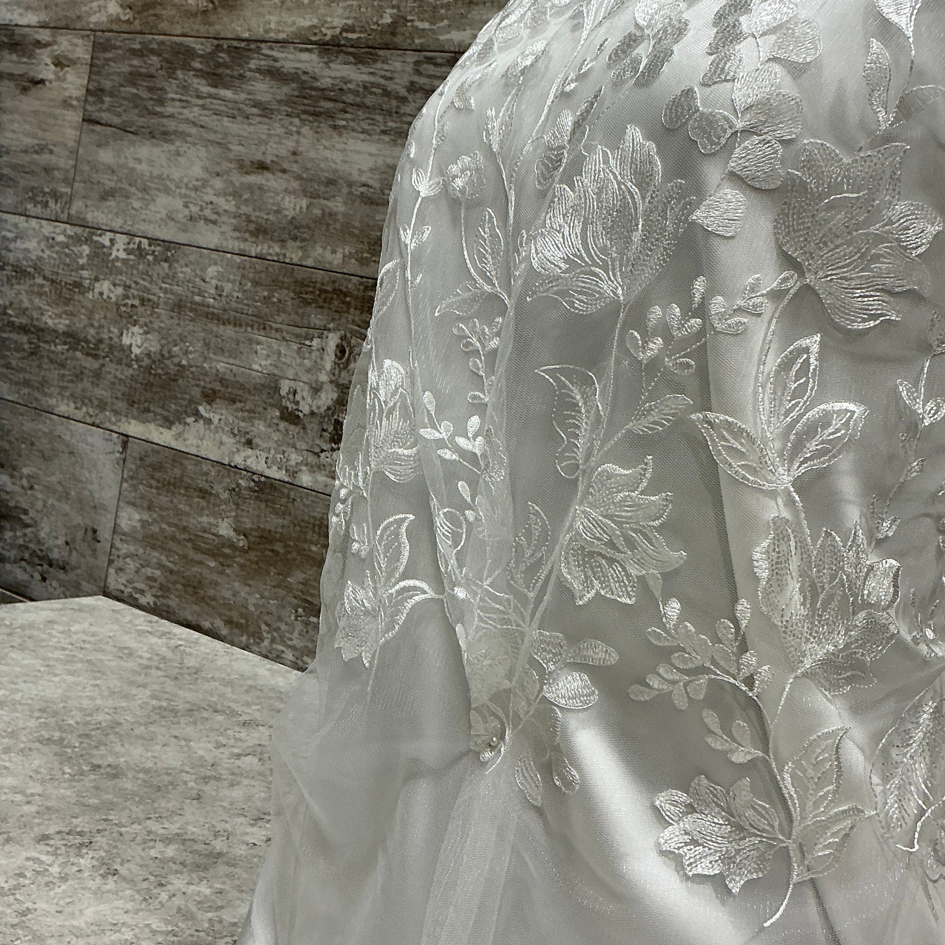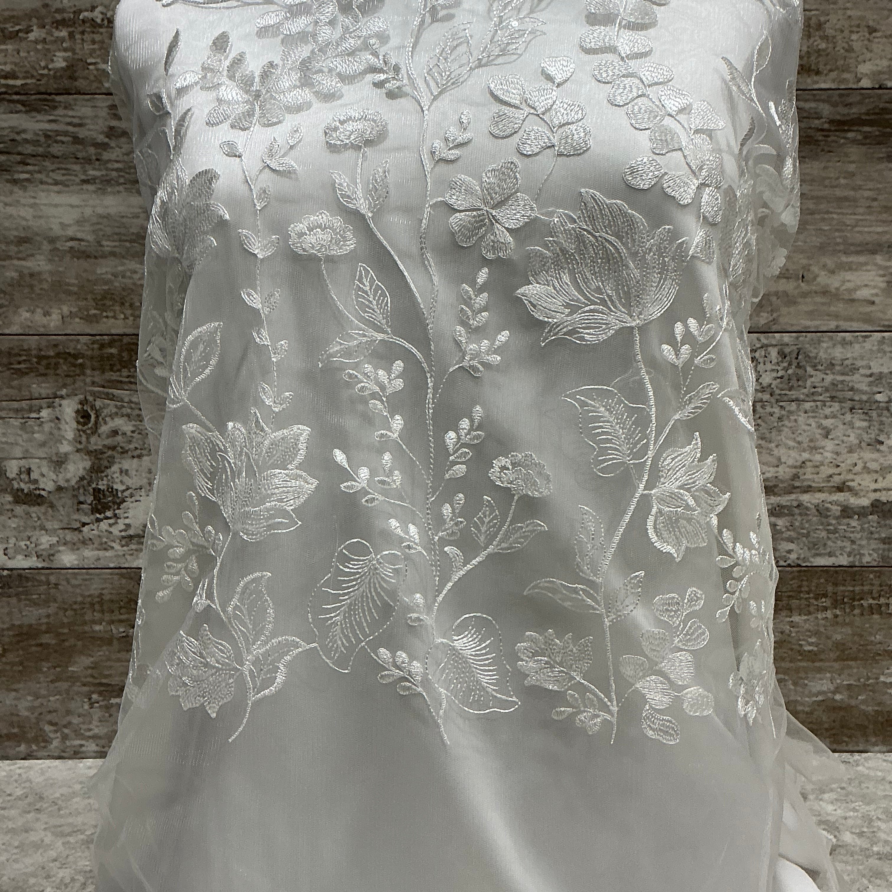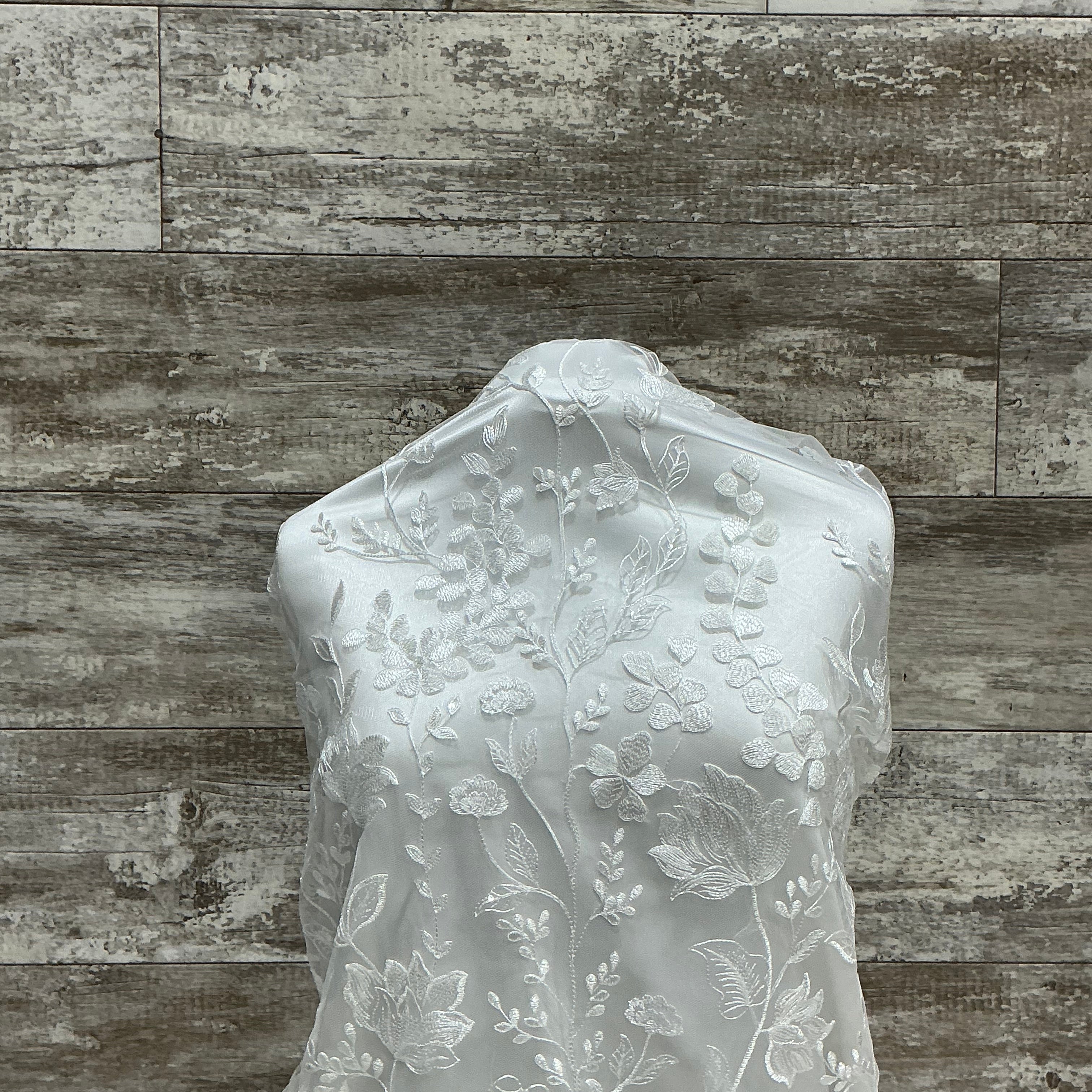 Description Details: This embroidered mesh is stunning! The ditsy floral trails upward with clear sequins shining with dewy sparkle.