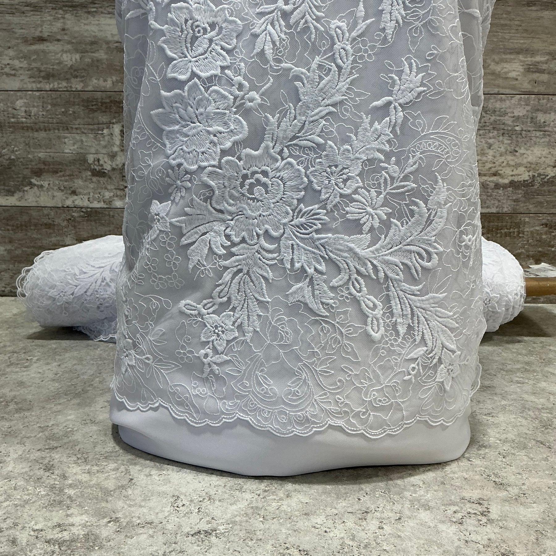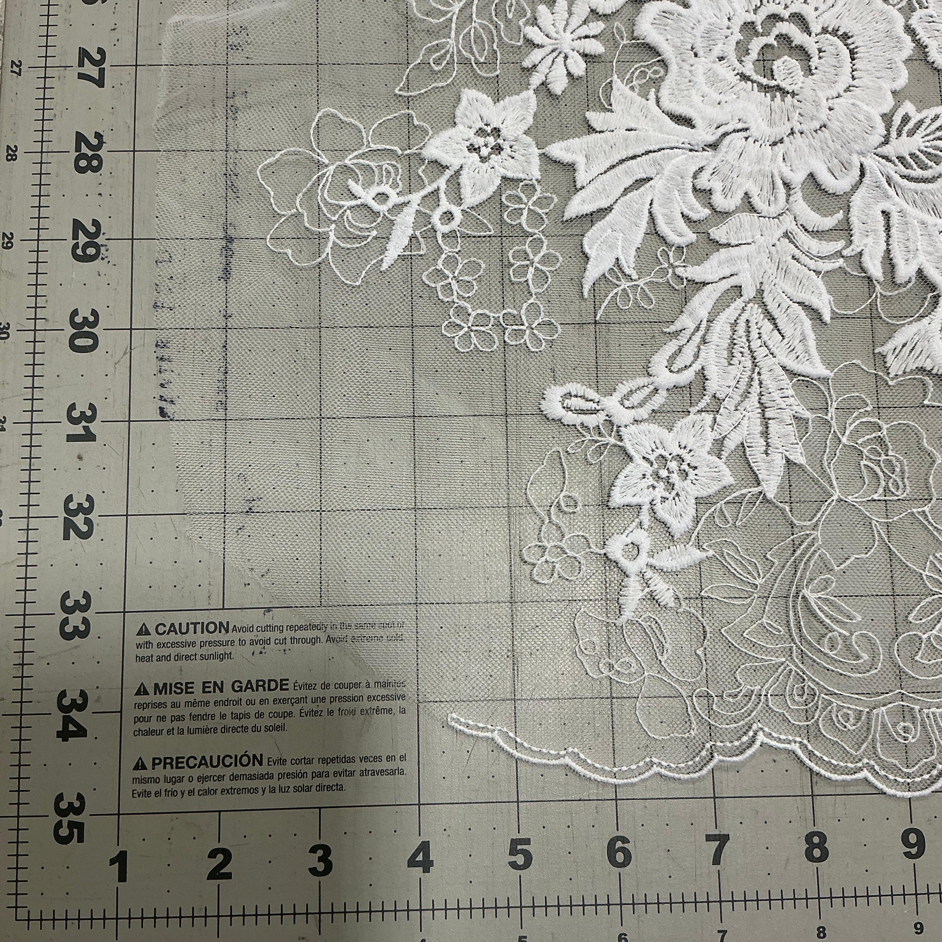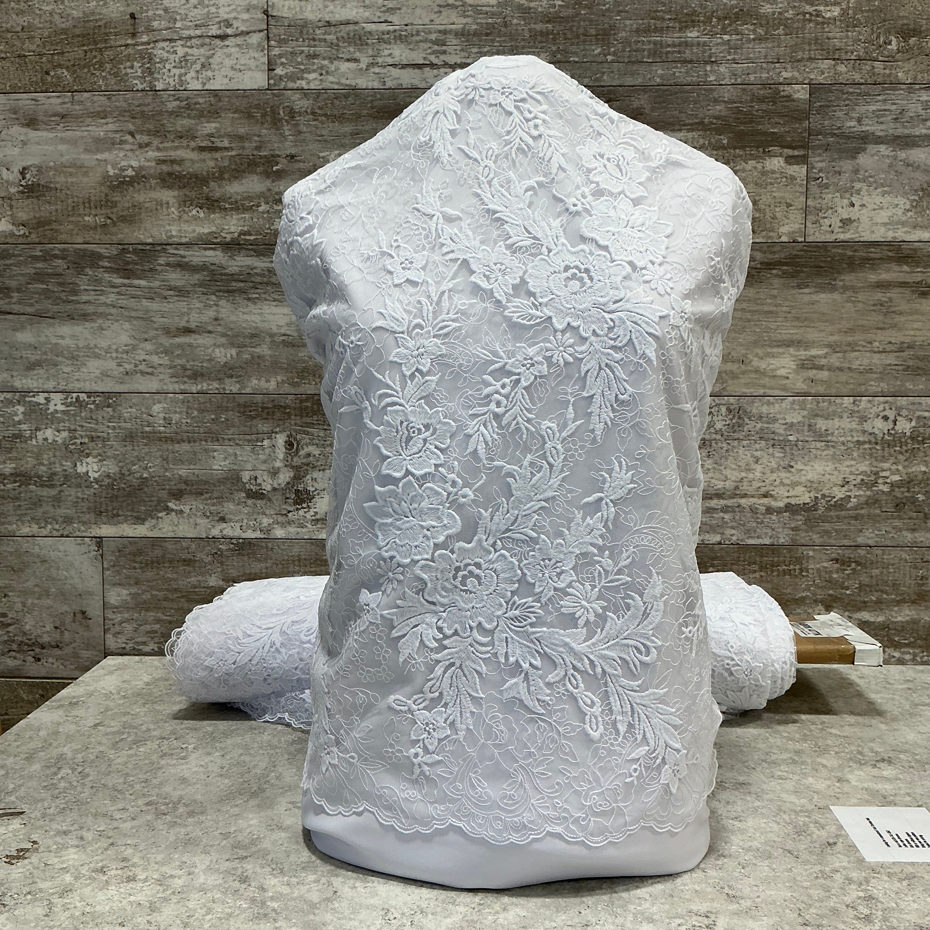 This embroidered crepe silhouettes a stately design for a statement dress. Bold designs flow in and around intricate details. The scallop hem is on both edges.