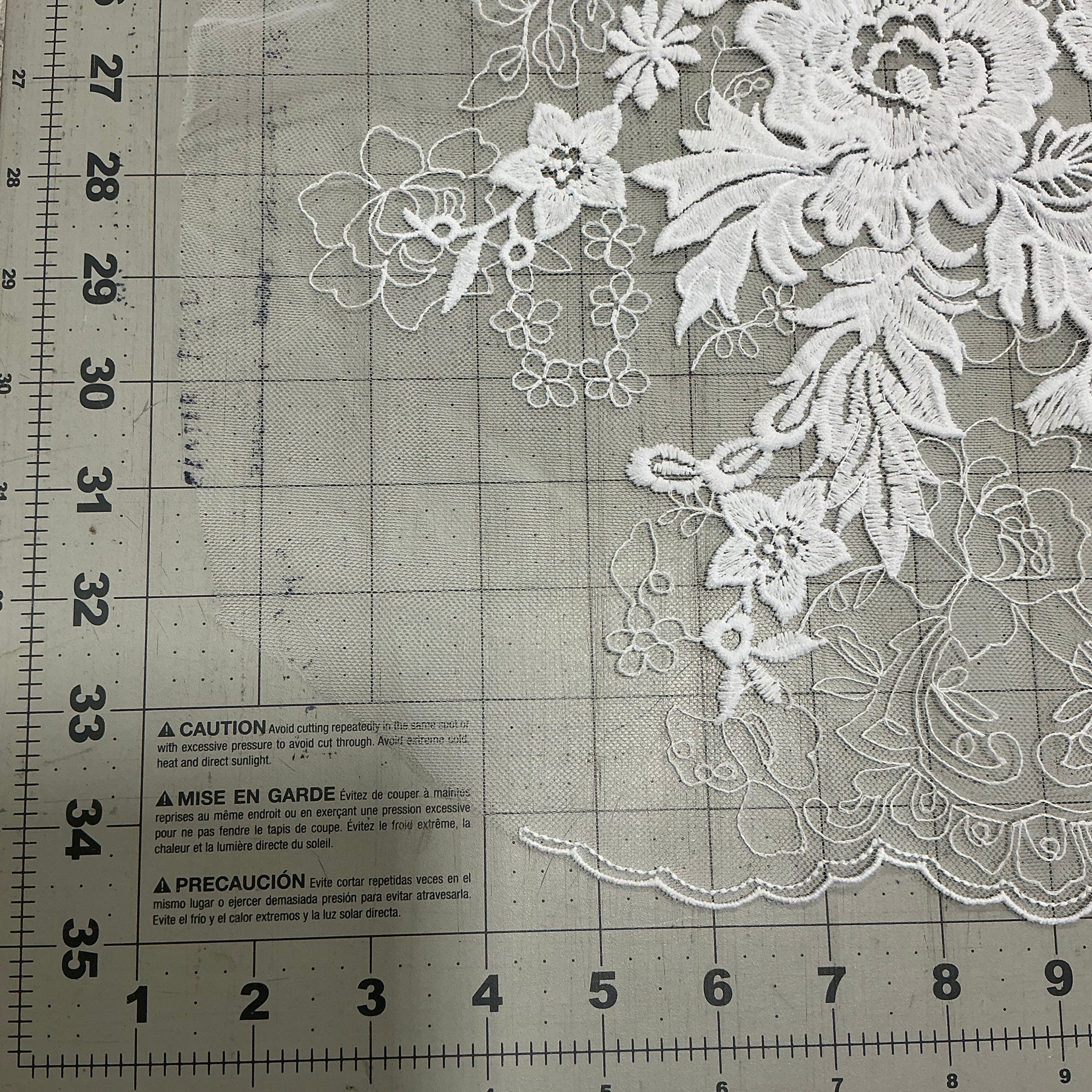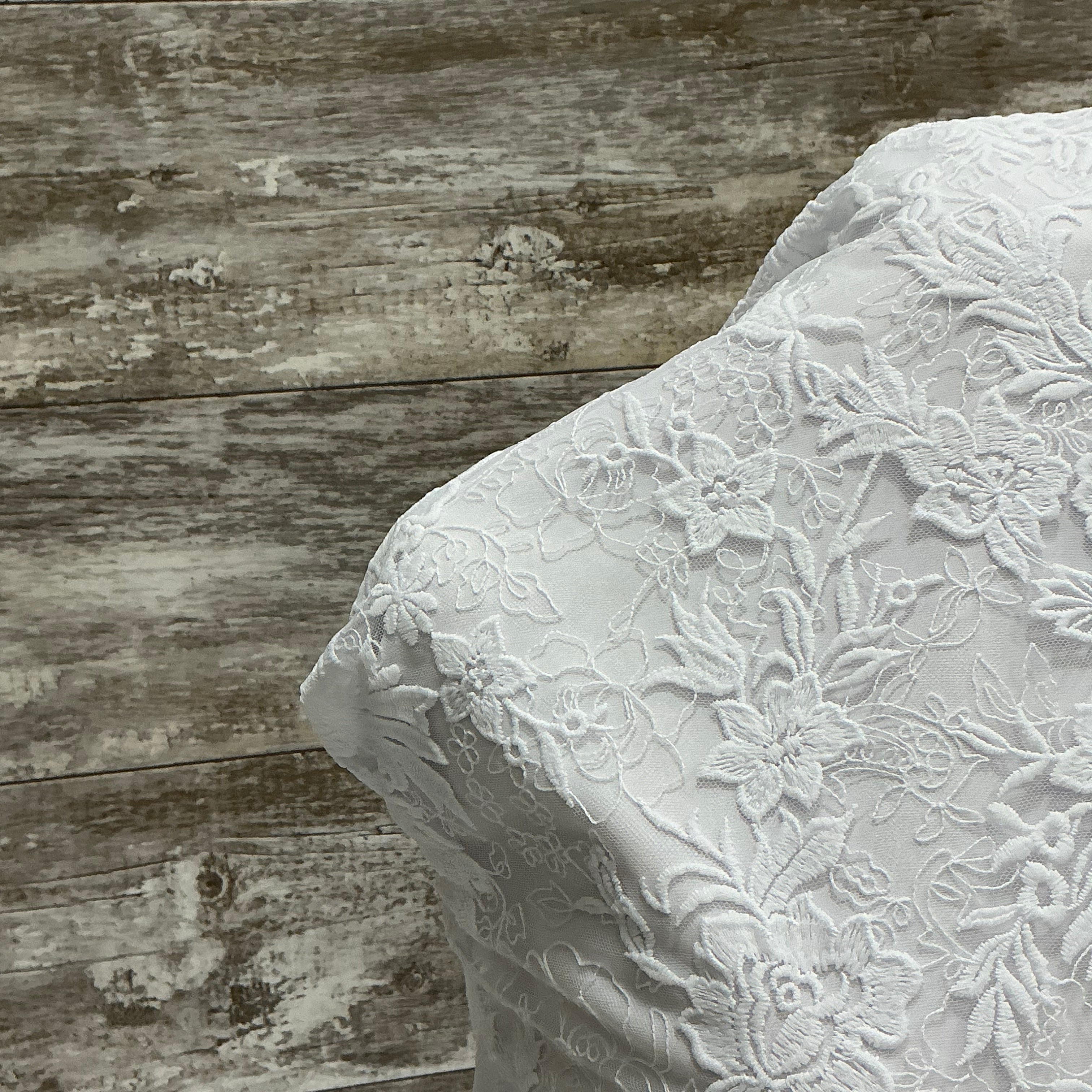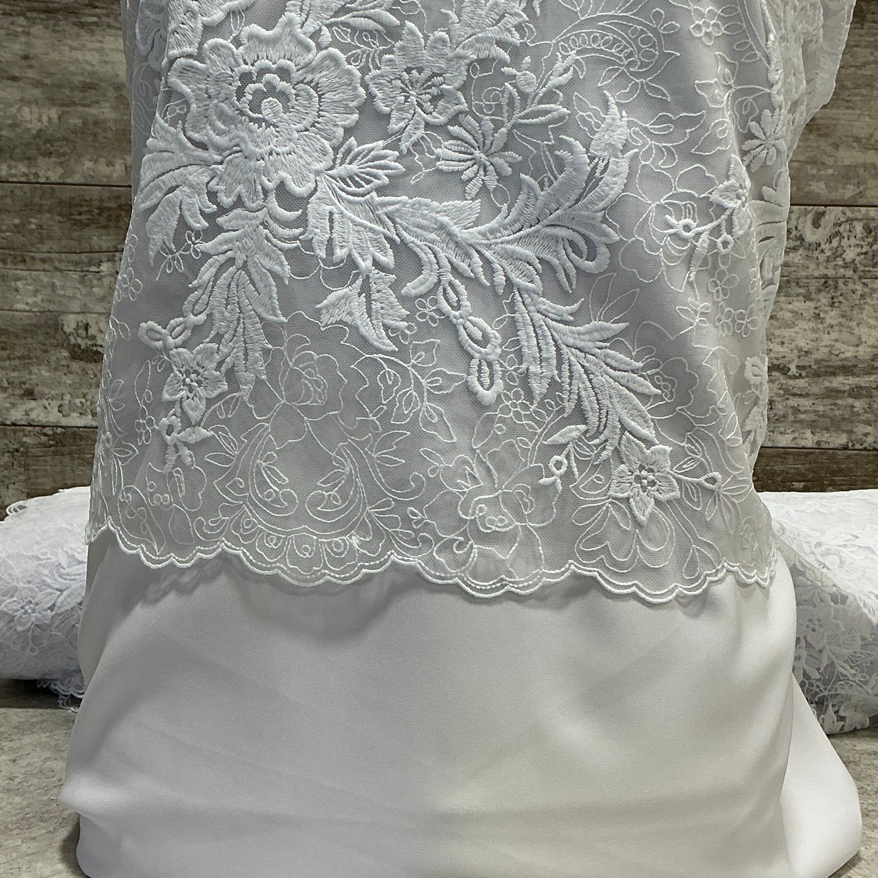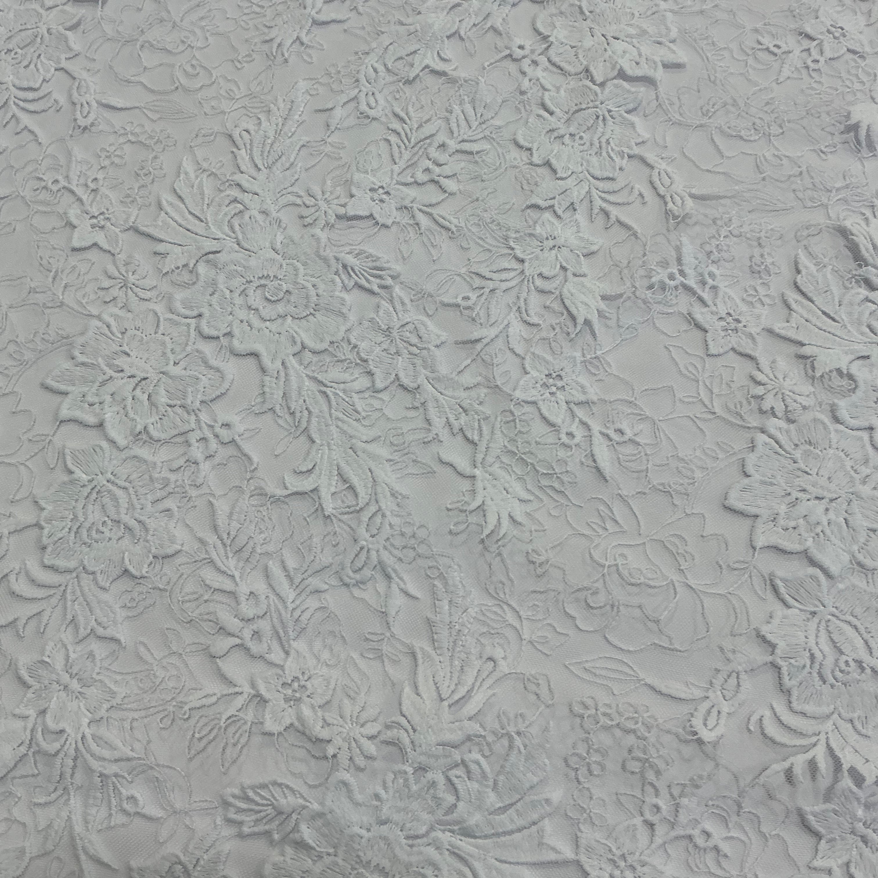 This embroidered crepe silhouettes a stately design for a statement dress. Bold designs flow in and around intricate details. The scallop hem is on both edges.