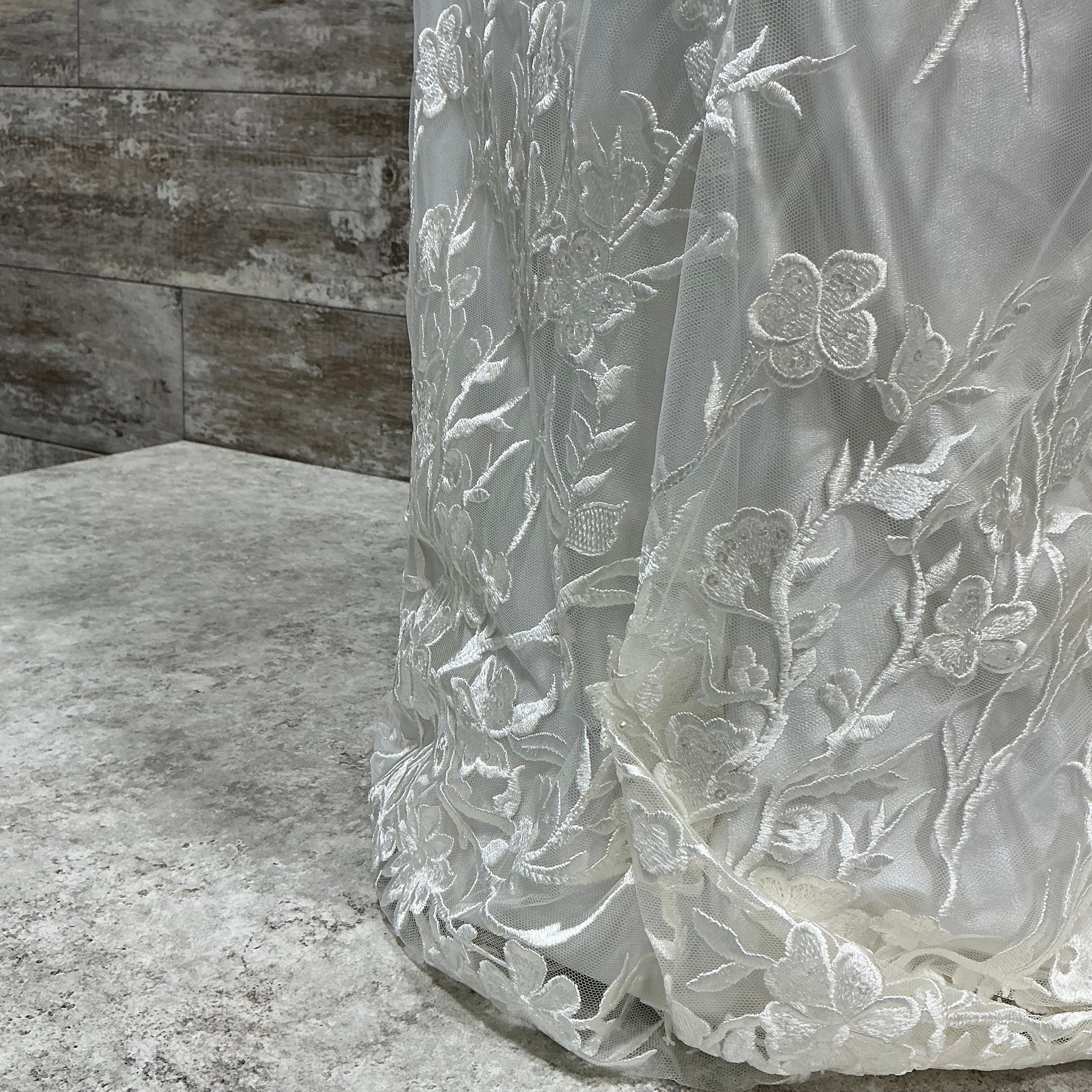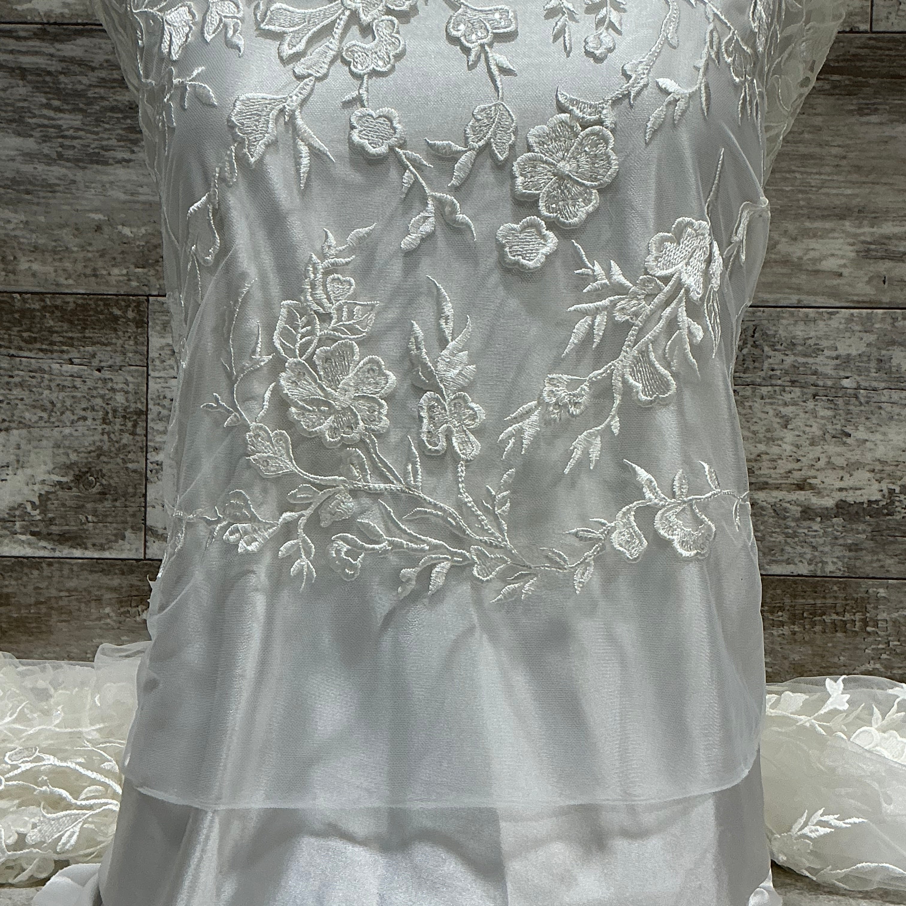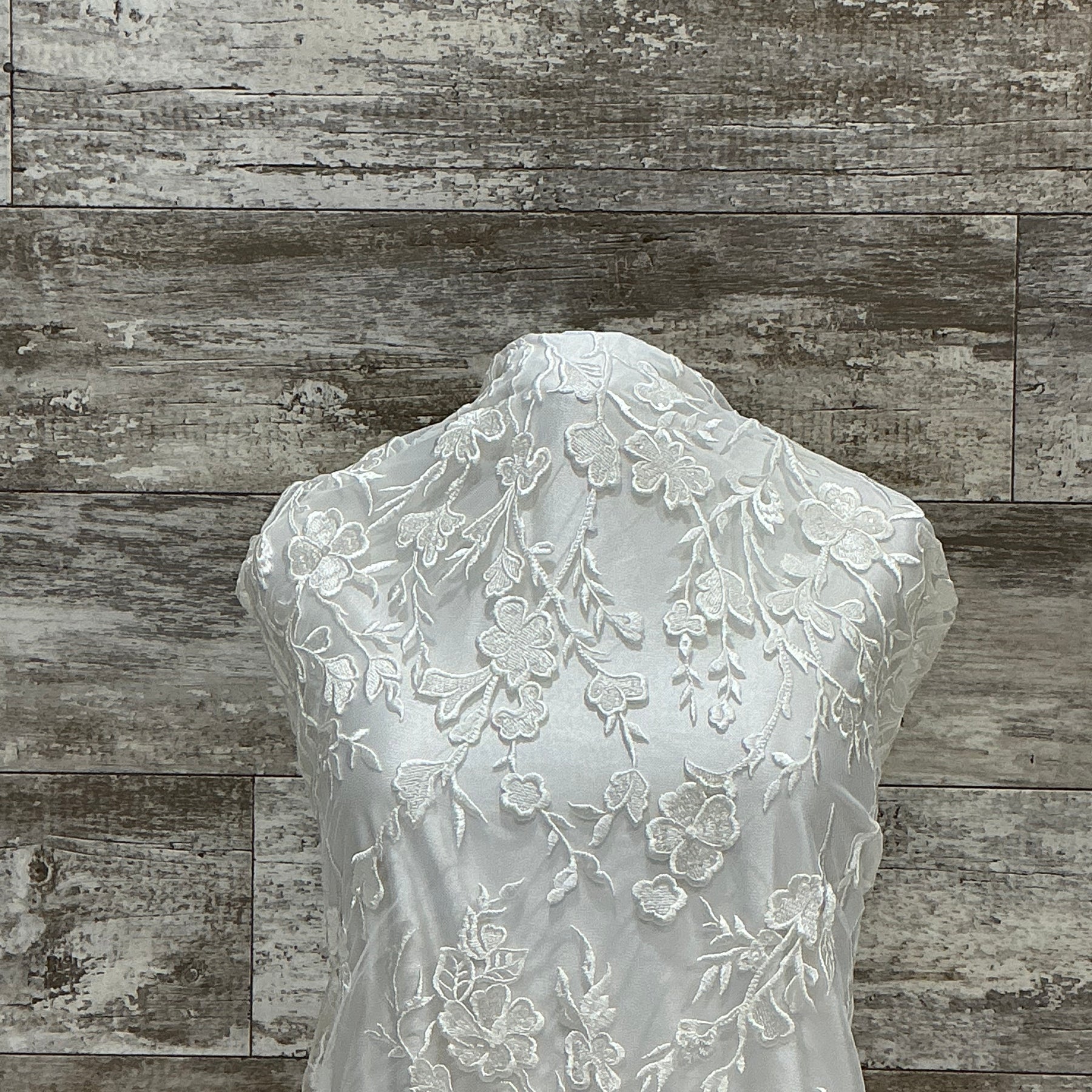 This delightful floral spritz sprays flowers exuding from the center outward. This pattern can be placed near the waist to splash down the skirt and spritz up the bodice/sleeves. The floral has a subtle sequined sparkle.