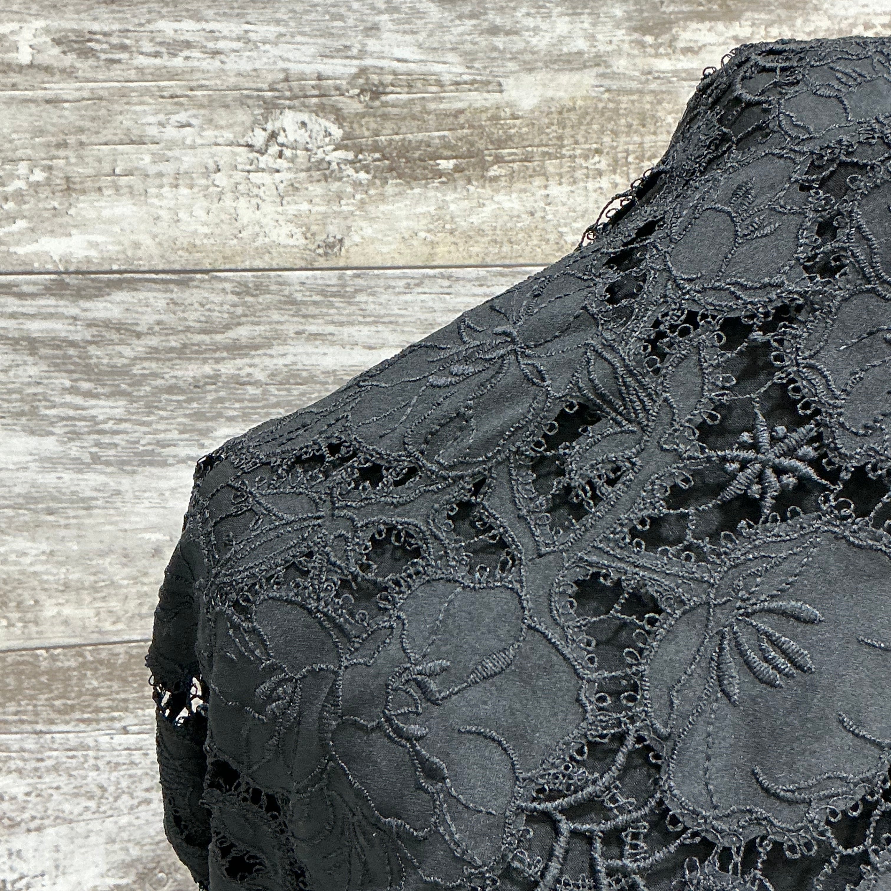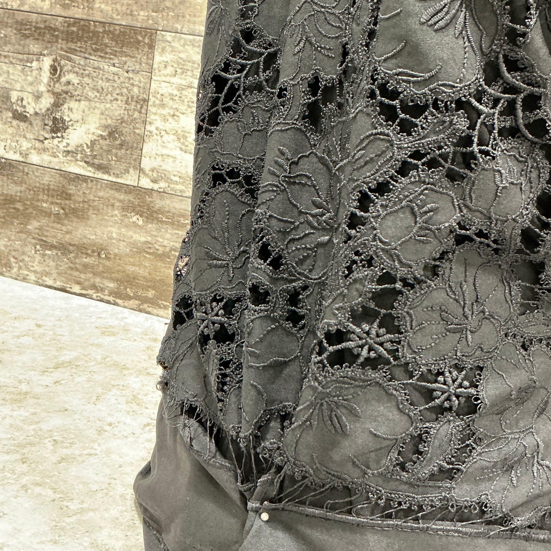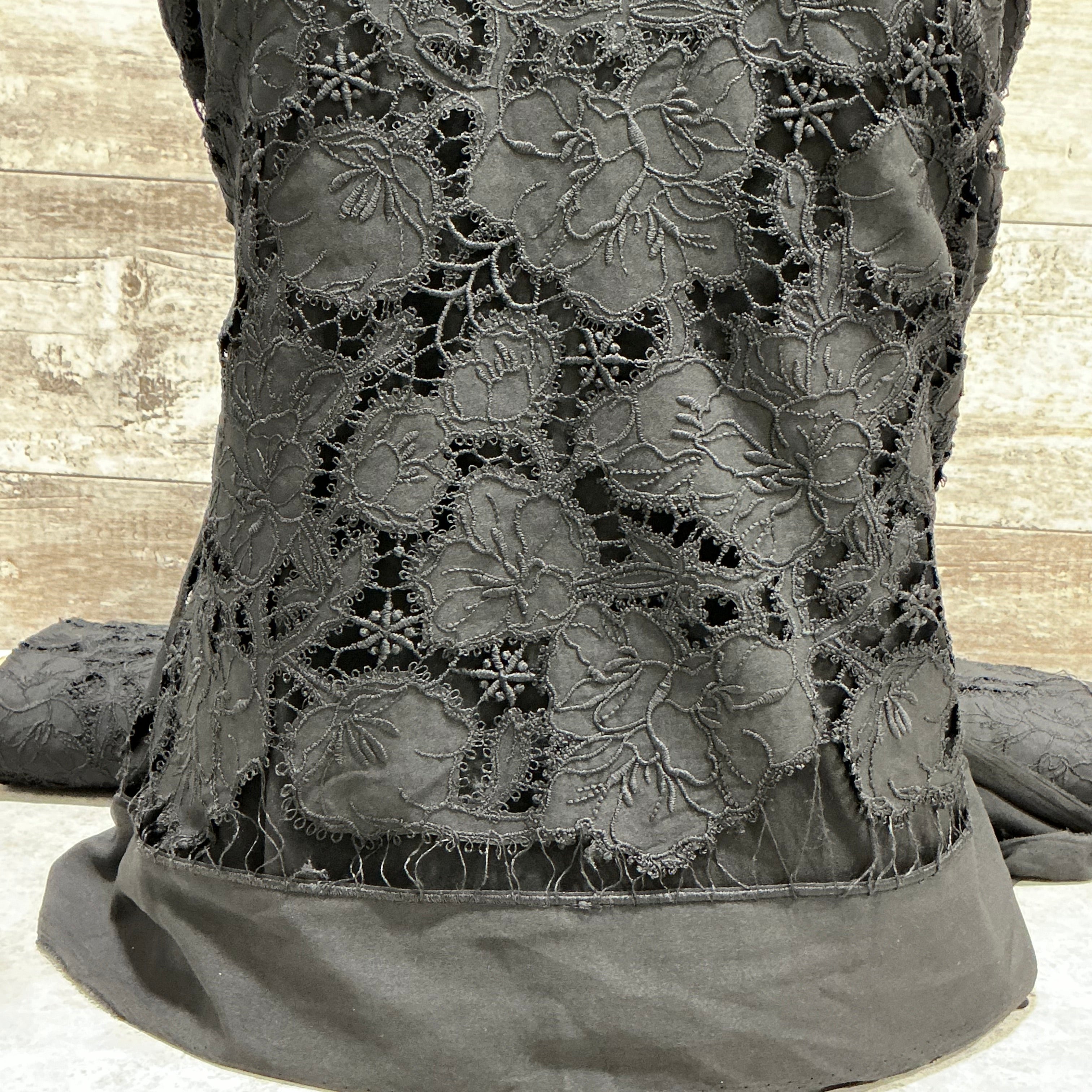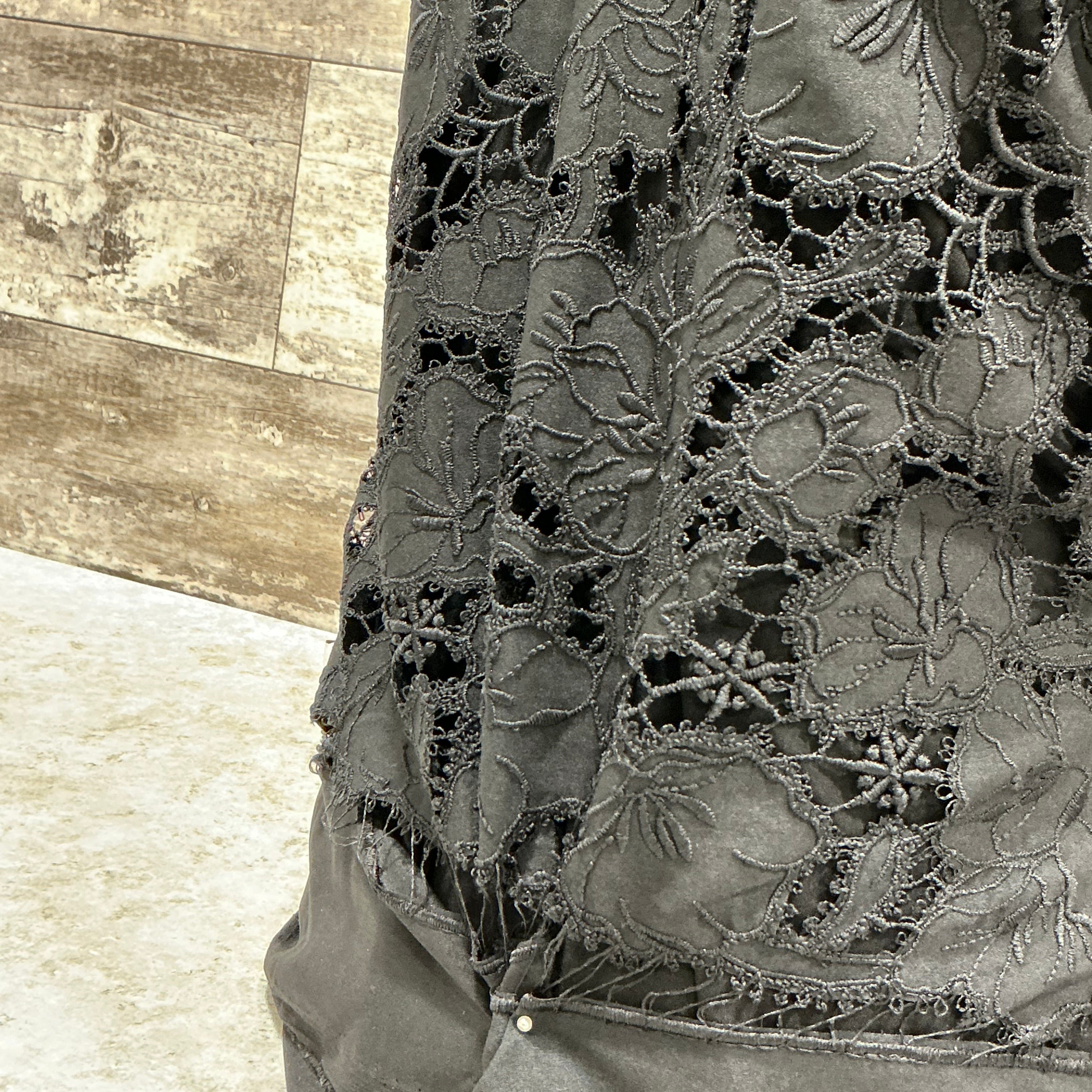 This embroidered crepe silhouettes a stately design for a statement dress. Bold designs flow in and around intricate details. The scallop hem is on both edges.
