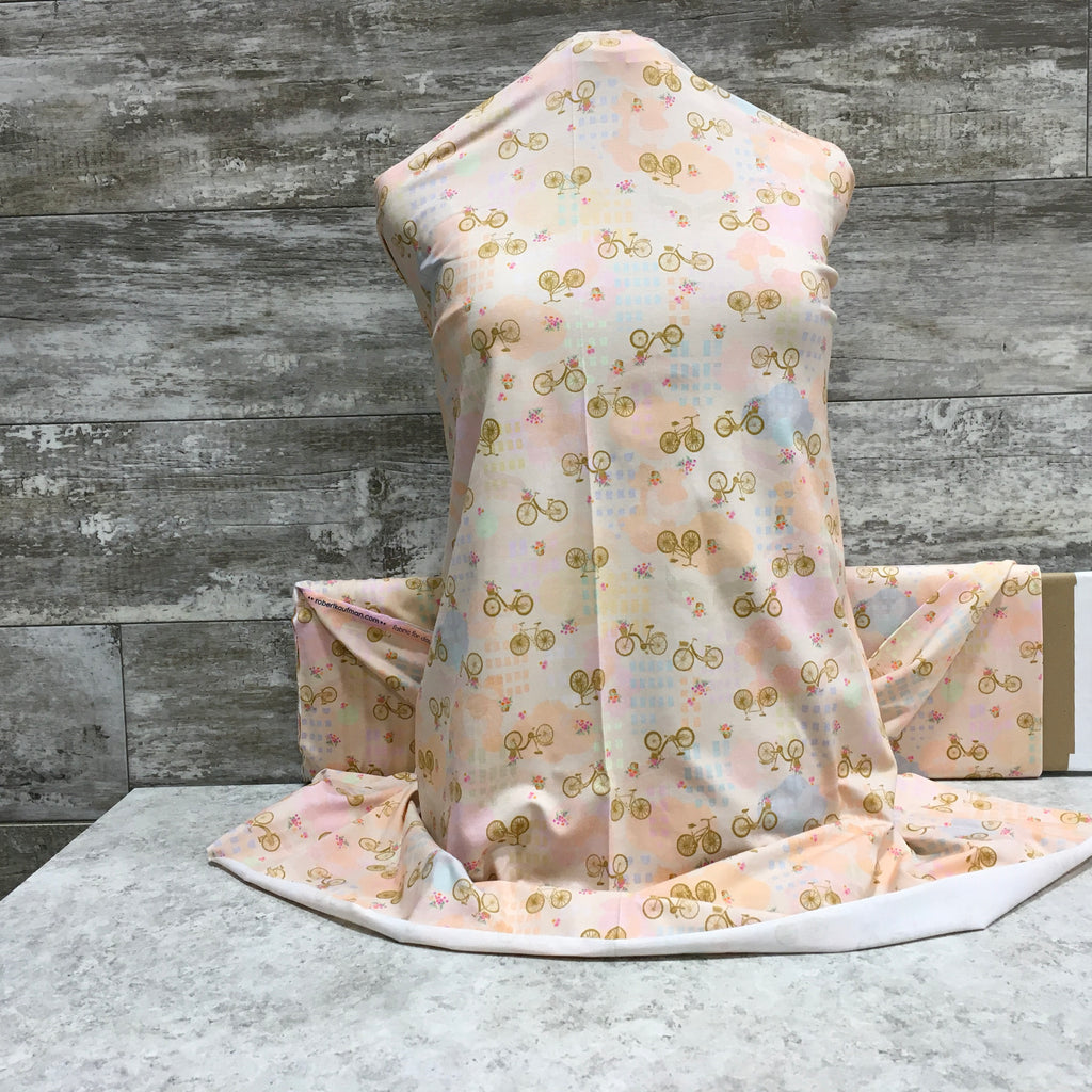 This Cotton Jersey fabric is perfect for a range of projects. It's made of 95% cotton and 5% spandex, providing a durable and comfortable material that's easy to work with. It features a repeating pattern of aqua bicycles, perfect for a youthful look. Sold by the half yard.